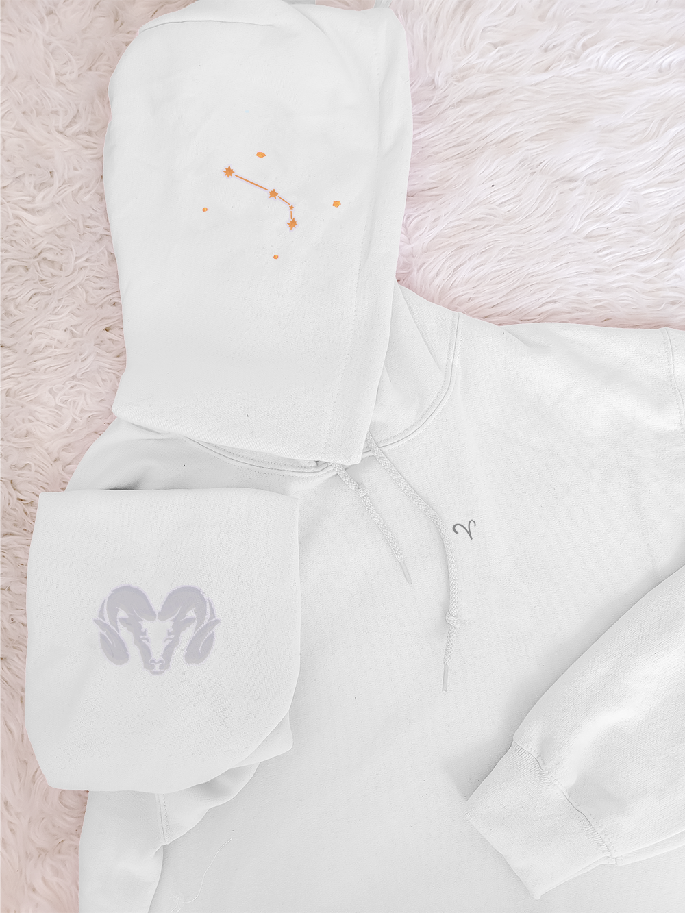 One-of-a-kind pastel embroidered hoodies featuring 3 designs of your zodiac sign! (Constellation with stars on right side of hood, ram on right sleeve, and Aries symbol on left chest)
