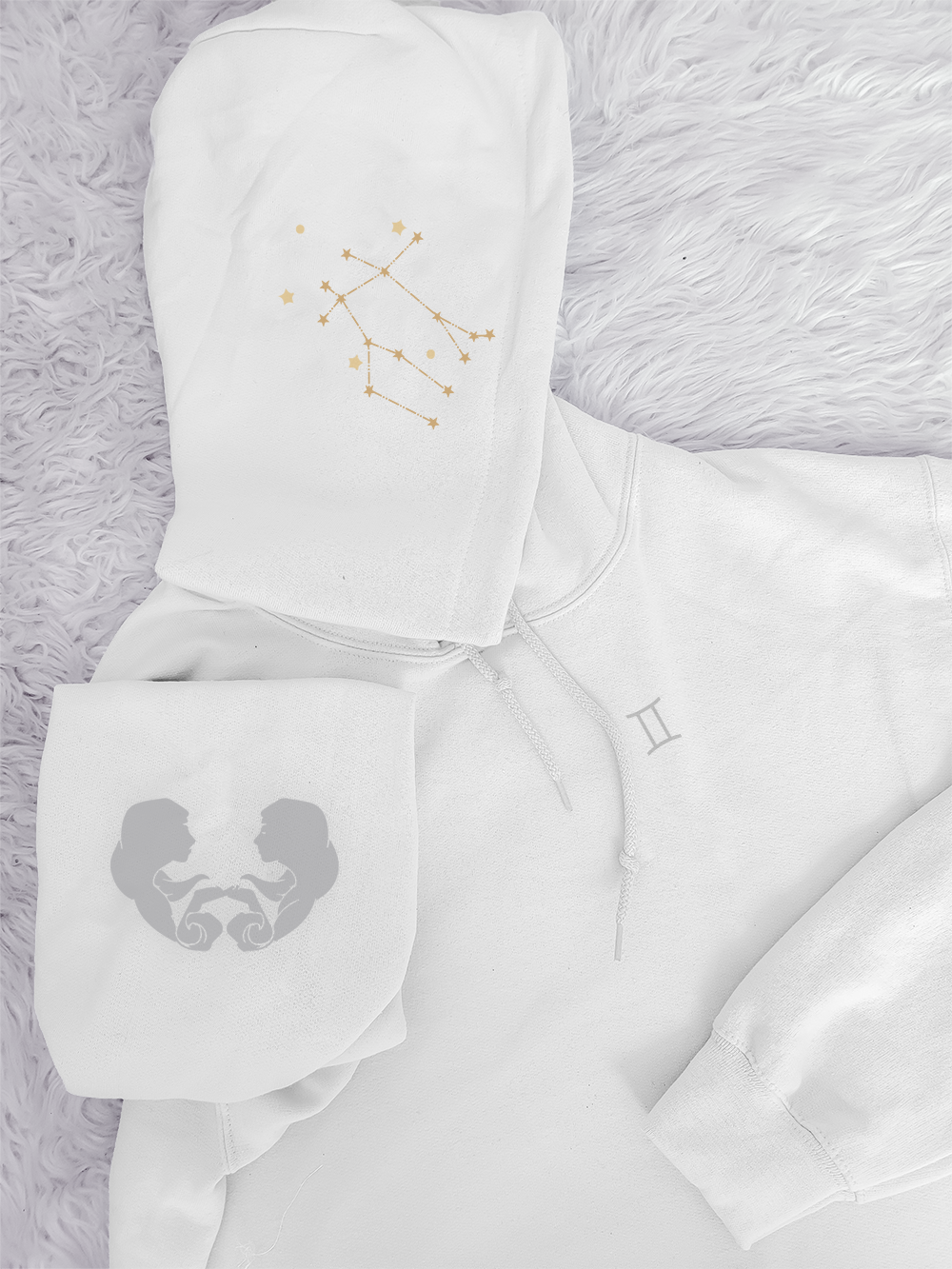One-of-a-kind pastel embroidered hoodies featuring 3 designs of your zodiac sign! (Constellation with stars on right side of hood, twins on right sleeve, and Gemini symbol on left chest)