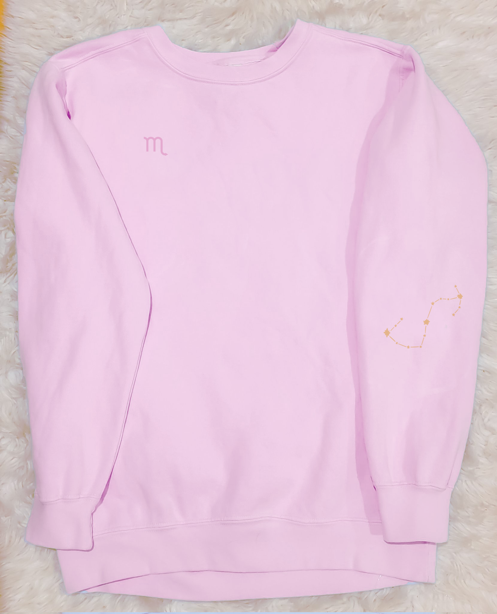 One-of-a-kind hand-dyed pastel embroidered crewnecks featuring 2 designs of your zodiac sign! (Constellation with stars on right sleeve, and Scorpion symbol on left chest)