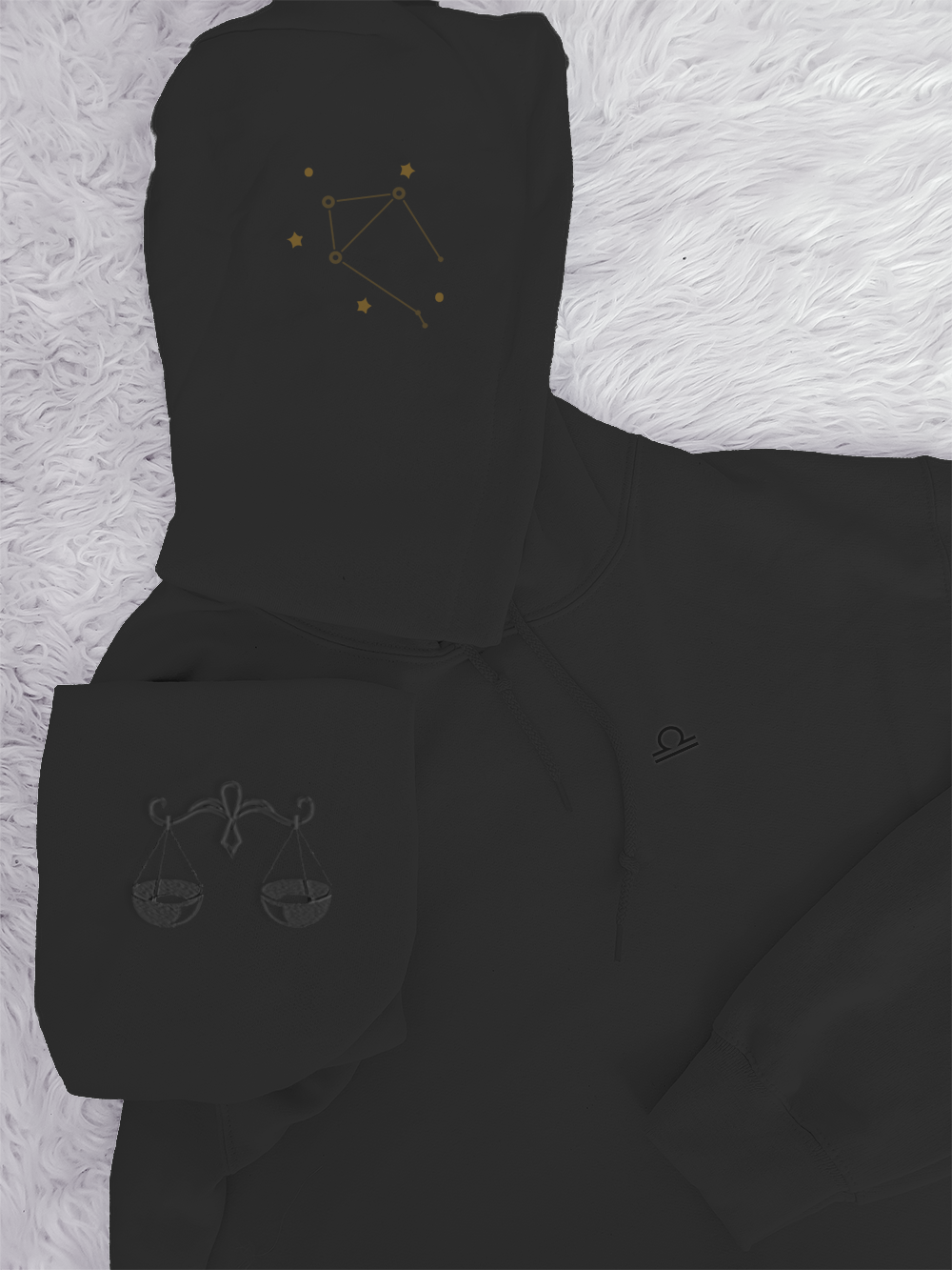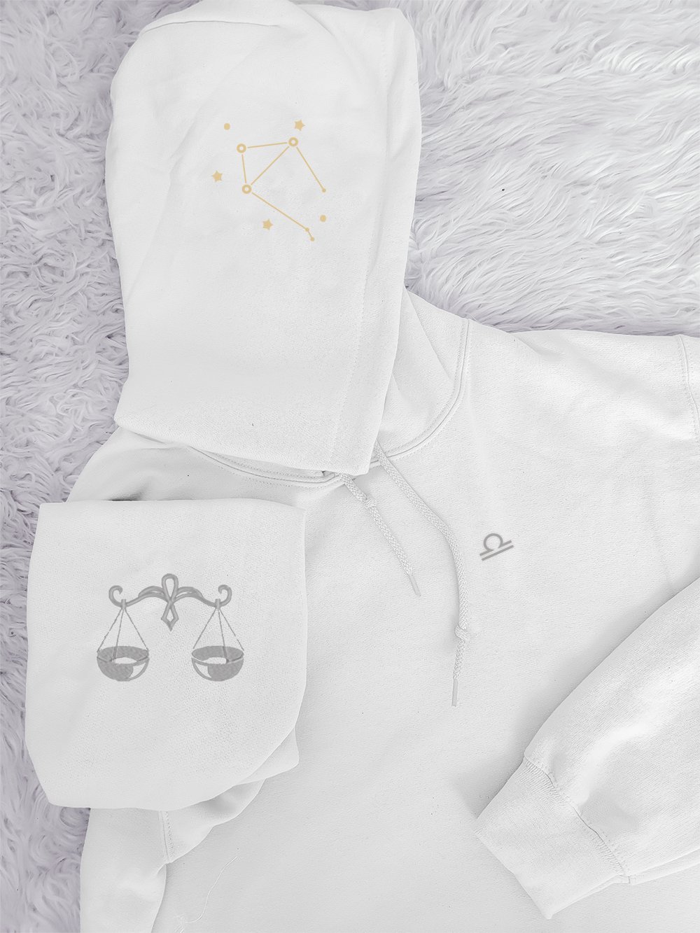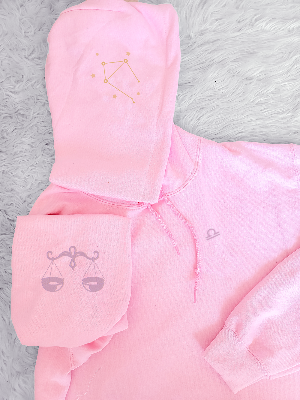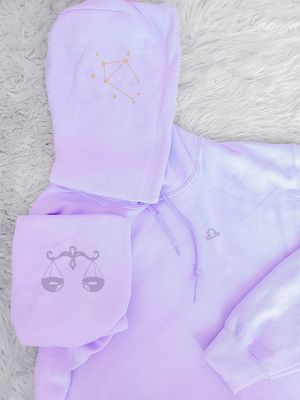 One-of-a-kind pastel embroidered hoodies featuring 3 designs of your zodiac sign! (Constellation with stars on right side of hood, scales on right sleeve, and Libra symbol on left chest)